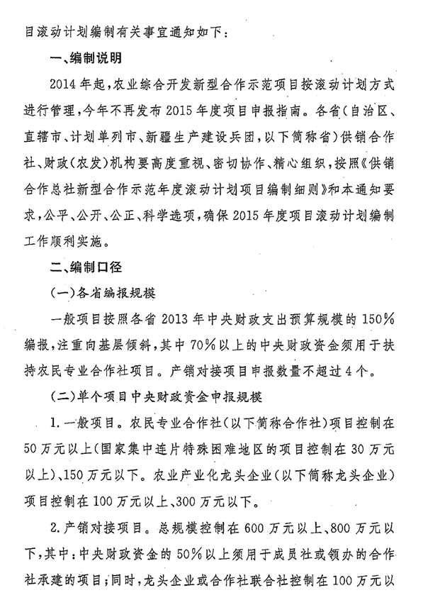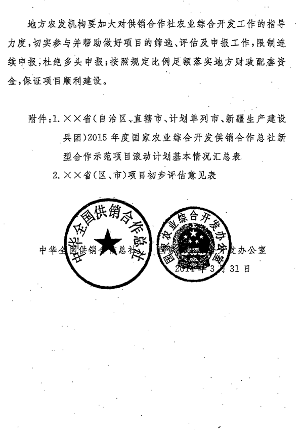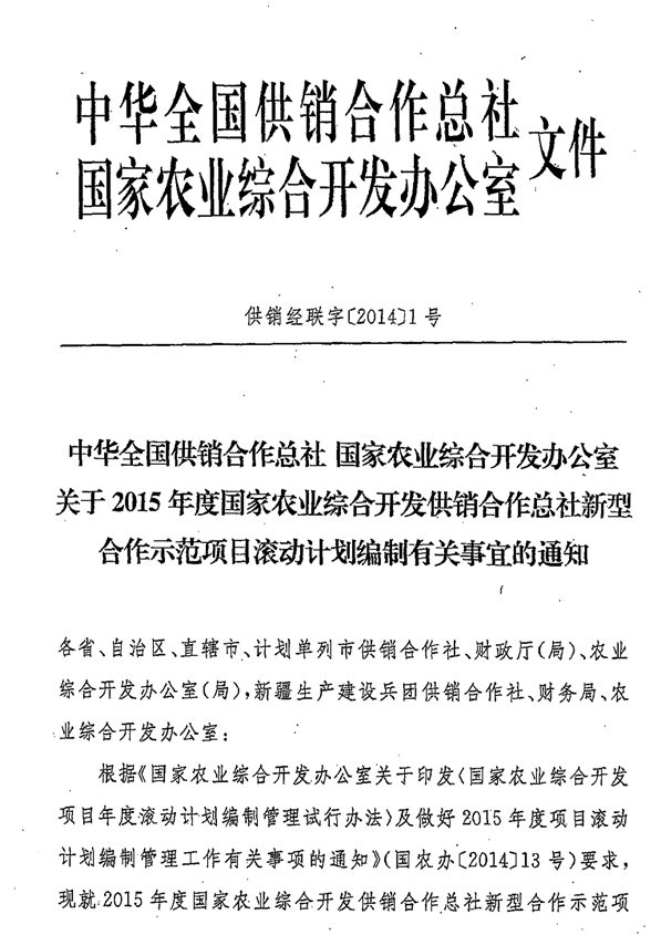 现将《中华全国供销合作总社 国家农业综合开发办公室关于2015年度国家农业综合开发供销合作总社新型合作示范项目滚动计划编制有关事宜的通知》(供销经联字〔2014〕1号)转发给你们,并就有关事项通知如下: