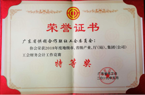 根据广东省总工会《关于2018年度地级市、省级产业、厅(局)、集团(公司)工会财务会计工作竞赛评比情况的通报》(粤工总〔2019〕28号), 工会委员会荣获广东省总工会2018年度工会财务会计工作竞赛特等奖。