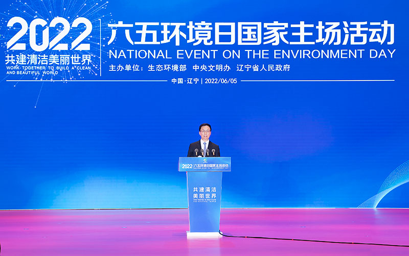 6月5日,2022年六五环境日国家主场活动在辽宁省沈阳市举行。中共中央总书记、国家主席、中央军委主席习近平发来贺信,向活动的举办表示热烈的祝贺。中共中央政治局常委、国务院副总理韩正在活动开幕式上宣读了习近平的贺信并讲话。新华社记者 李涛 摄