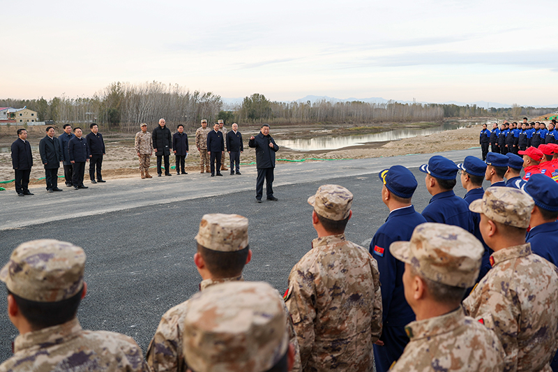 11月10日,中共中央总书记、国家主席、中央军委主席习近平在北京、河北考察灾后恢复重建工作。这是10日下午,习近平在河北保定涿州市白沟河治理工程(涿州段)考察时,同水利工程建设人员和曾经参加涿州抗洪救援的解放军和武警部队官兵、民兵预备役人员、消防救援队伍等方面的代表亲切交流。新华社发(盛佳鹏 摄)
