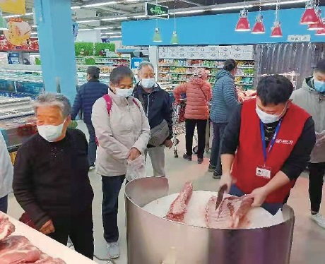 北京市朝阳区的一家超市内,市民正等待购买工作人员分割的鲜排骨。
