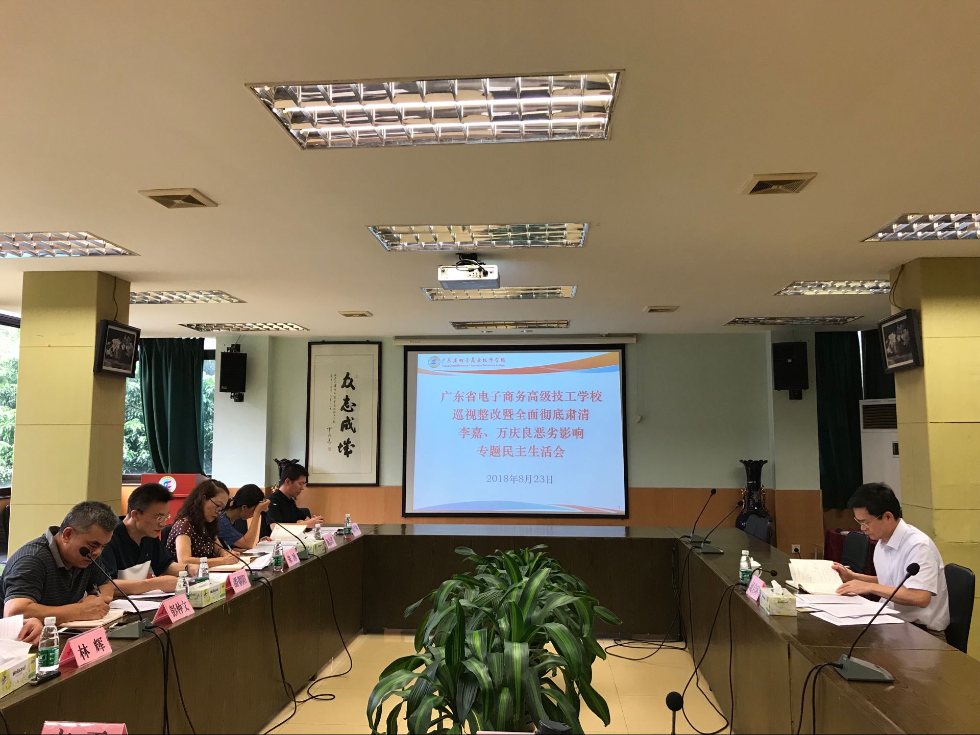 8月23日下午,省电子商务高级技工学校召开巡视整改暨全面彻底肃清李嘉、万庆良恶劣影响专题民主生活会。会议由学校党委书记、校长潘朝阳主持,全体党委委员参加。省社党组成员、理事会副主任何启环到会督导,省社人教处有关同志一同参会。
