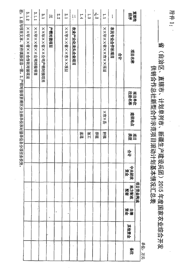 现将《中华全国供销合作总社 国家农业综合开发办公室关于2015年度国家农业综合开发供销合作总社新型合作示范项目滚动计划编制有关事宜的通知》(供销经联字〔2014〕1号)转发给你们,并就有关事项通知如下: