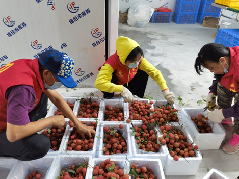 6月19日,广州市从化区新从供农产品经营有限公司工作人员及电商销售团队正在对新鲜荔枝进行分拣和保冷包装。(中华全国供销合作总社供图)