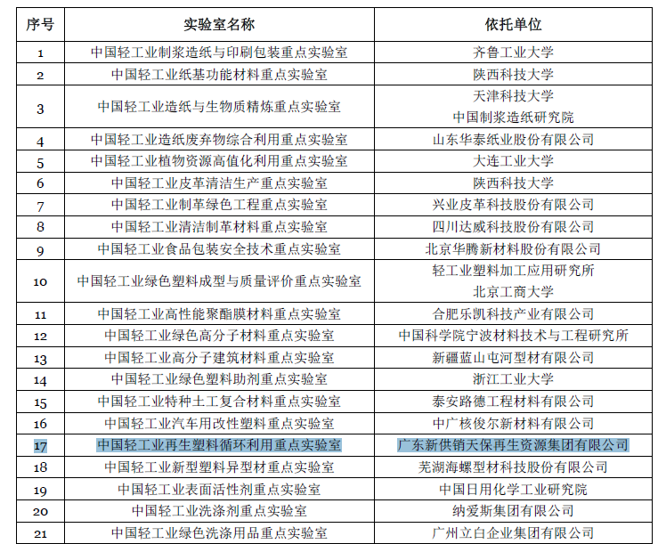 2016年5月6日,广东新供销天保再生资源集团有限公司的“中国轻工业再生塑料循环利用实验室”被中国轻工业联合会认定为首批中国轻工业重点实验室。