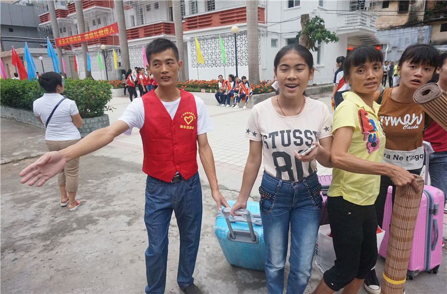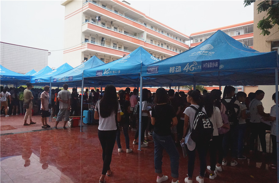 在湛江市各大车站,我校设立接站处,安排老师、学生志愿者和专车迎接前来报到的新生及家长,一句“您是报到的新生吧”的问询,一句“我来帮您拎行李吧”传递着温情的帮助,他们坚守岗位,对应车次无遗漏的把每一位新生及家长安全送至学校。报到注册处排起了新生及家长“长龙”,班主任们忙碌地填写、审核学生注册信息,耐心解答学生和家长的疑问。在老师们和志愿者们的协助下,每一位新生都妥善地安排到事先编排好的宿舍。