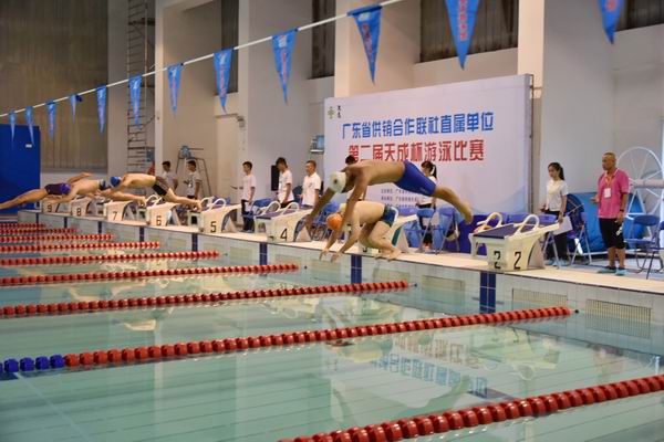 2016年9月2日下午,新学年典礼一结束,省财经学校教工游泳队便赶往广州奥林匹克中心游泳馆参加2016年省供销社第二届“天成杯”游泳比赛共21个项目的比赛,取得总分第一名的好成绩。