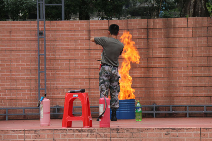 随后,朱教官还对新生进行详细的说明教育,讲解其他突发情况的应对措施,并讲解了灭火器和宿舍水袋的使用方法。台上教官亲自示范了灭火器的使用技巧,并邀请台下新生代表上台实操灭火器的喷灭明火,以加深新生印象。
