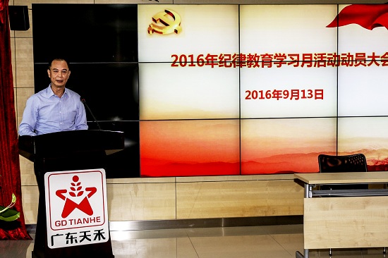 会议由公司纪委书记刘艺同志主持。公司党委书记邹宁同志首先宣读了《2016年广东天禾农资股份有限公司纪律教育学习月活动方案》,对纪律教育学习月活动的各项工作安排进行部署。