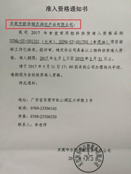 5月2日,天润粮油集团中标东莞市东职后勤服务有限公司2017年食堂常用物料供货准入资格采购项目(项目编号:DZHQ-ST-201701大米,DZHQ-ST-201702食用油),成为该项目的粮油供应商之一,准入期限为2017年7月1日至2019年5月31日。