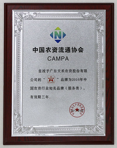 广东天禾“GDTIANHE+图形”品牌被评为2016年中国农资行业知名品牌(服务类),广东天禾中加化肥有限公司“彩虹”品牌被评为2016年中国农资行业知名品牌(产品类),有效期三年。