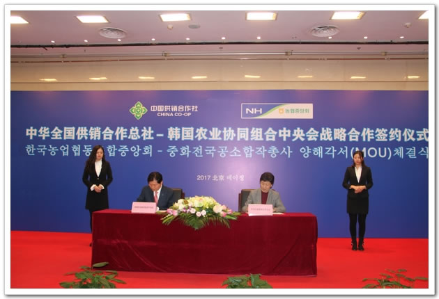 12月12日,中华全国供销合作总社与韩国农业协同组合中央会在京签署战略合作协议。根据协议,双方将在金融、贸易、投资、培训、电子商务等领域开展广泛合作。总社党组书记、理事会主任王侠,韩国农协中央会会长金炳沅分别致辞并代表双方签署《中韩合作社战略合作谅解备忘录》。